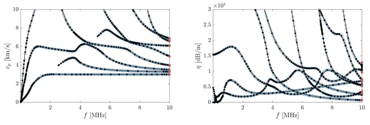 Dispersion of a titanium plate radiating into teflon and brass.Semi-analytical methods for modeling guided waves in structures of constant cross-section yield frequency-dependent polynomial eigenvalue problems for the wavenumbers and mode shapes. Solving these eigenvalue problems over a range of frequencies results in continuous eigencurves. Recent research has shown that eigencurves of differentiable parameter-dependent eigenvalue problems can alternatively be computed as solutions to a system of ordinary differential equations (ODEs) obtained by postulating an exponentially decaying residual of a modal solution. Starting from an approximate initial guess of the eigenvalue and eigenvector at a given frequency, the complete eigencurve is obtained using standard numerical ODE solvers. We exploit this idea to develop an efficient method for computing the dispersion curves of plate structures coupled to unbounded solid or fluid media. In these scenarios, the approach is particularly useful because the boundary conditions give rise to nonlinear terms that severely hinder the application of traditional solvers. We discuss suitable approximations of the nonlinearity for obtaining initial values, analyze computational costs and robustness of the proposed algorithm, and verify results by comparison against existing methods.